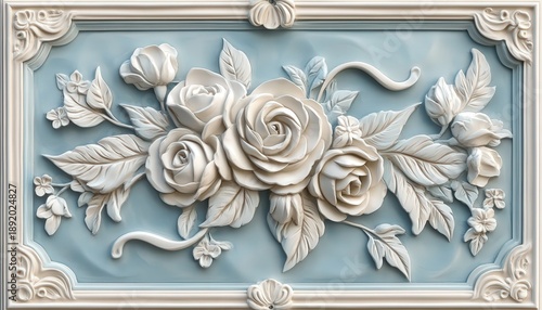 Detailed three dimensional floral bas-relief sculpture is set within an ornate rectangular frame against a soft background