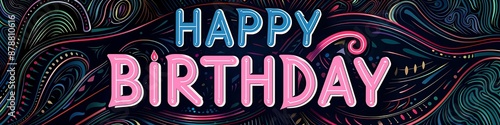 Detailed vector illustration of "HAPPY BIRTHDAY" in pink and blue letters on an abstract background with patterns, curved lines, and swirls in dark colors.