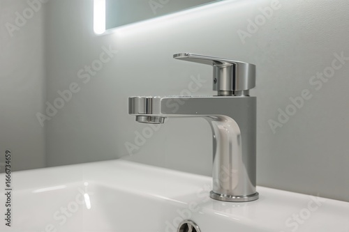 Detailed view of a gleaming metallic tap in a bathroom