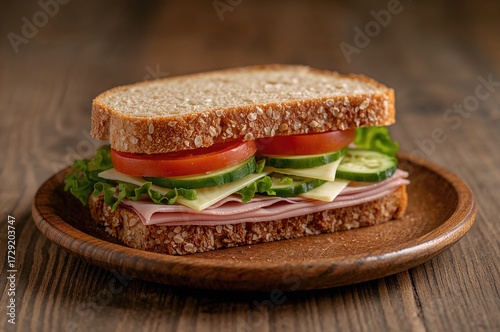 Detailed view of a sandwich featuring ham, cheese, lettuce, tomato, and cucumber on whole grain bread served on a wooden platter