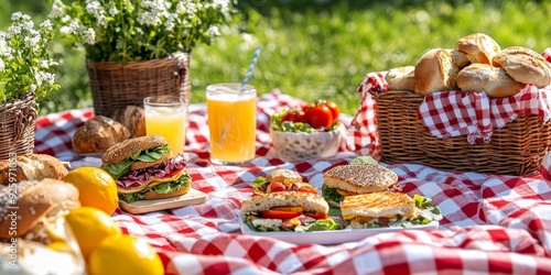 Detailed view of a summer picnic setup with a checkered blanket, sandwiches, and lemonade, showcasing the enjoyment of outdoor seasonal activities