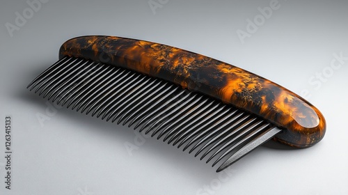 Detailed view of a tortoiseshell-patterned comb with curved handle on white surface