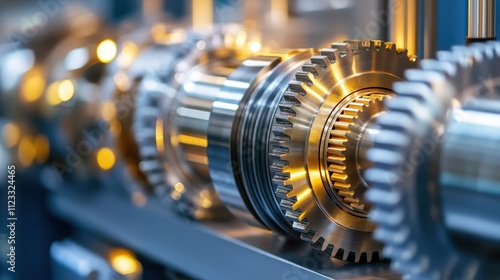 Detailed view of shiny metal gears in industrial machinery, illuminated by warm lighting, showcasing precision engineering.
