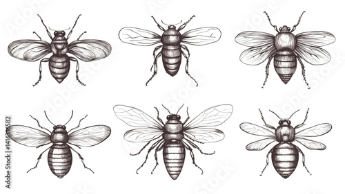 Detailed Vintage Engravings of Six Different Bees A Collection of Detailed Illustrations of Honey Bees, showcasing their intricate anatomy and diverse appearances