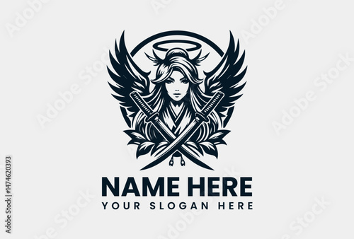 Detailed Winged Samurai Woman Silhouette. Mythical Warrior Motif Vector Logo