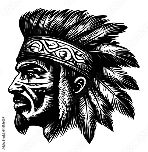 Detailed Woodcut Style Profile of Indigenous Warrior with Headband