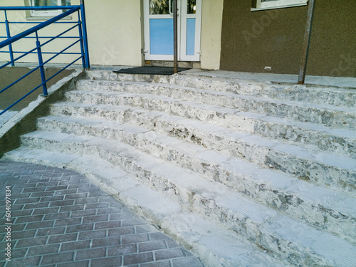 deteriorating exterior concrete staircase with rust stains and cracks, requiring specialized high-strength rust-inhibiting cement resurfacing to restore its appearance and function.