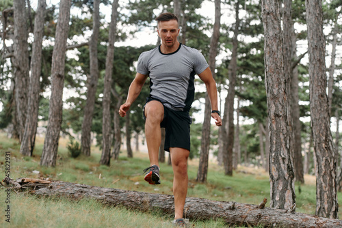 Determined Man Conquering Forest Obstacles with Grit and Speed