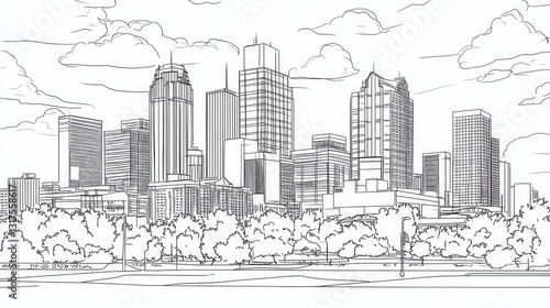 Detroit Michigan Cityscape Line Art Coloring Page - A detailed line art coloring page featuring the Detroit, Michigan skyline. It symbolizes urban life, architecture, city planning, nature