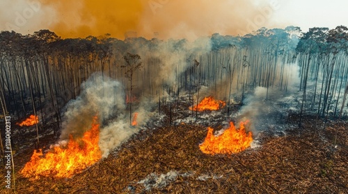 Devastating Wildfire Consumes Forested Landscape with Thick Smoke and Intense Flames, Highlighting Environmental Concerns and Ecological Impact on Wildlife Habitats