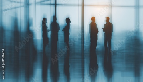 Developing A Business Team In A Modern Office With Panoramic Windows In A Building. Team Work In A Blurred, Faded Wide Photo.