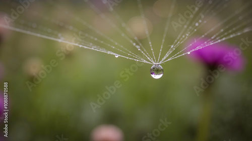 Dew drop on spider web with flower background