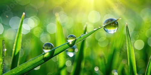 Dew Drops on Green Grass Blades with Sunlight and Soft Bokeh Effect
