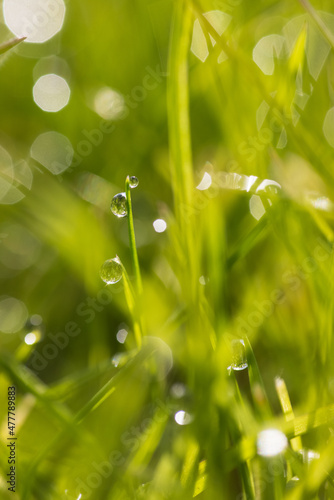 Dew drops on the spring, green grass. Meadow macro close up in nature.
