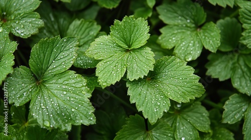 Dewy green strawberry leaves, garden background, nature texture, perfect for website, blog
