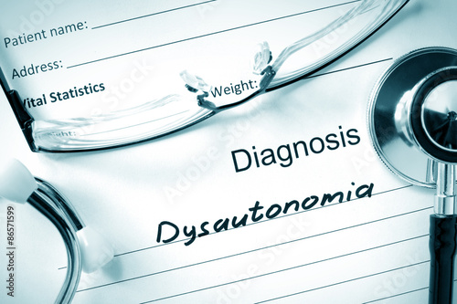 Diagnostic form with diagnosis Dysautonomia and pills.
