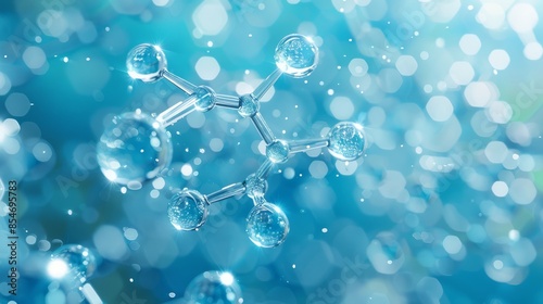 Diagonal DNA molecule and transparent droplets, shallow focus. Biochemistry, modern medicine or genetic research related 3D rendering background