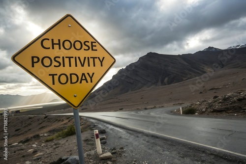 Diamond shaped yellow road sign chooses positivity today inspiring message in nature