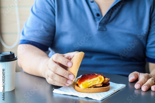 Diet failure of fat man eating fast food hamberger. Happy smile overweight person . Hate to diets. Very fat man eating fast food,close up hamberger.