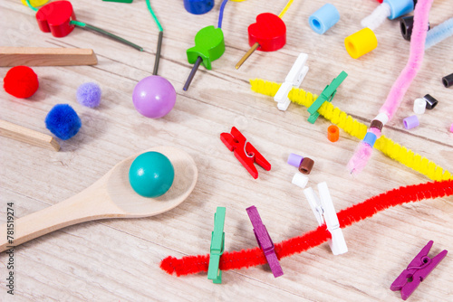 Different accessories used to play or learn at school and preschool. Development of kids motor skills, creativity and logical thinking