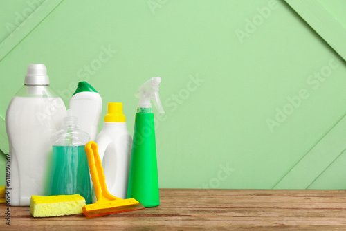 Different cleaning supplies on wooden table