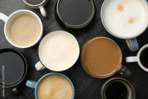 Different coffee drinks in cups on dark textured table, flat lay