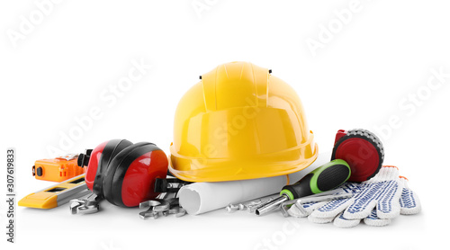 Different construction tools and hard hat isolated on white