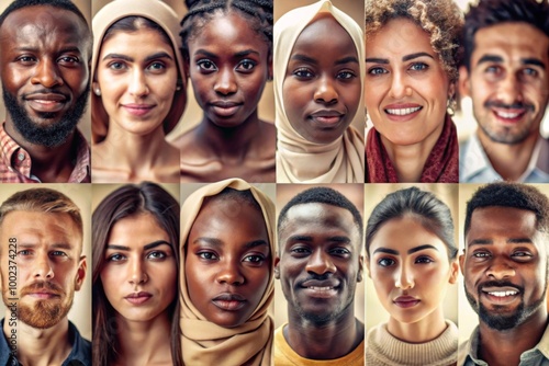 different portrait of men and women of diverse age and race. Combination of faces. Humanity. Concept of social equality, human rights, freedom, diversity, acceptance
