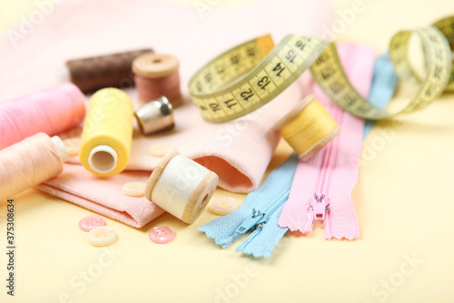 different sewing accessories on the table. Threads, needles, pins, fabric and sewing scissors close up