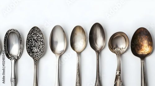 Different stylish silver spoons on white