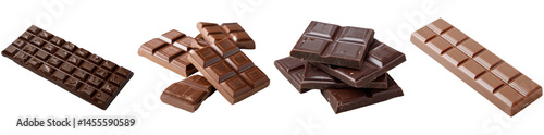 Different types of chocolate bars arranged on a white background showcase a variety of shapes and colors, highlighting the deliciousness of chocolate snacks