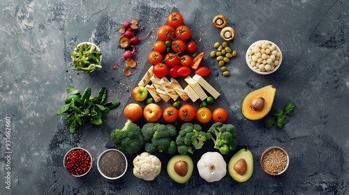 Different types of food from the food pyramid seen from above