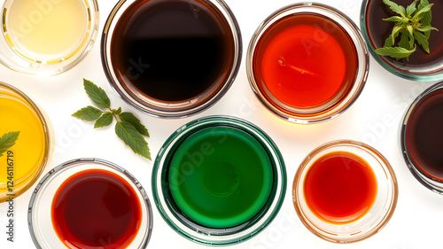 Different types of vinegar in glass bowls isolated on white background, top view. Generative AI