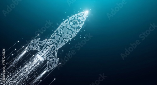 Digital abstract rocket launch illustration made of low polygon geometry against a dark blue background, symbolizing business growth and technology acceleration.