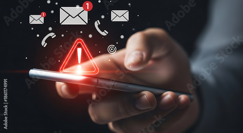 Digital Alert Holding Smartphone with Red Warning Triangle Notifications Error