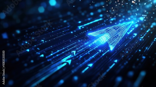 Digital arrow glowing in blue, representing speed and direction in a tech-inspired setting.