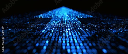 digital arrow pointing upwards shaped by vibrant blue matrix binary code. with pixelated motifs emerging from behind .