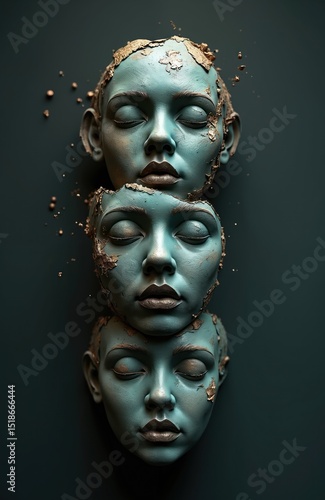 Digital artwork of three fragmented sculptures. Woman face statues with gold decor floating on dark background. Art concept of beauty and abstract portraiture. 3D render illustration.