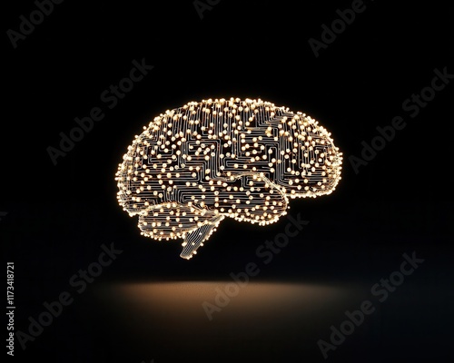 Digital brain surrounded by glowing data lines, representing deep learning and insights, AI, big data processing
