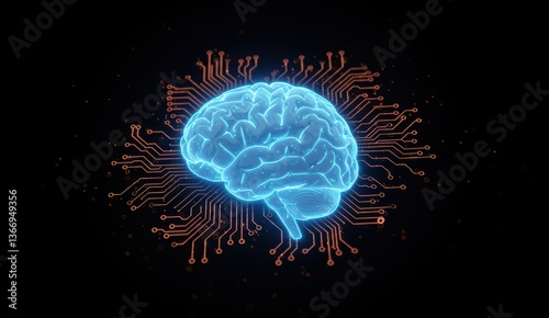Digital brain with circuit design. Glowing neon visualization symbolizes technology and artificial intelligence.