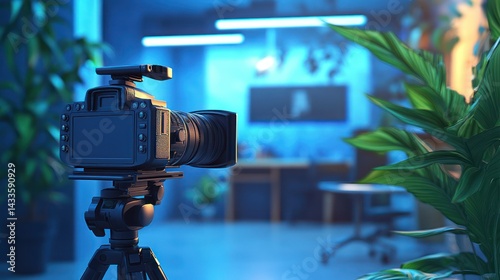 Digital camera stands, ready capturing images, videos, showcasing professional setup, artistic style, modern office aesthetics.