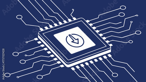 Digital circuit design featuring microchip with intricate connections, symbolizing innovation and technology