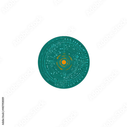 digital circular pattern with intricate geometric designs and central orange core, resembling futuristic interface or technological diagram. design is set against transparency background