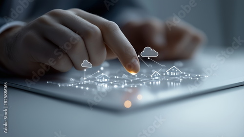 Digital community, smart homes and digital community. DX, Iot, digital network in society concept. suburban houses in digital environment. Hand edited AI.
