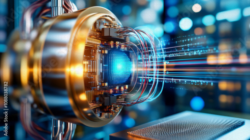 Digital Core: Futuristic Technology and Data Stream. A captivating image showcasing a futuristic technological core with a vibrant data stream emanating from its center.
