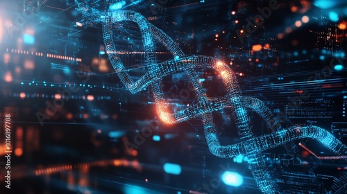 Digital DNA Helix Glowing with Blue and Orange Light