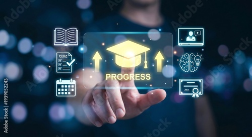 Digital Education Progress Concept: Person touching glowing graduation cap icon with learning icons, representing online courses and success