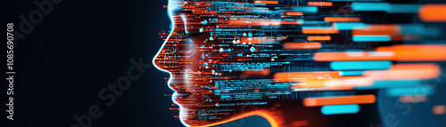Digital face with AI data visualization, showcasing technology and innovation. image captures essence of artificial intelligence and its impact on human like features
