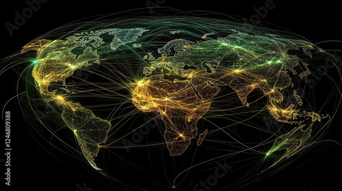 Digital globe with connected trade routes, global network, world trade.