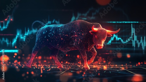 Digital glowing bull symbolizing stock market strength and financial growth with a futuristic background and graph lines.